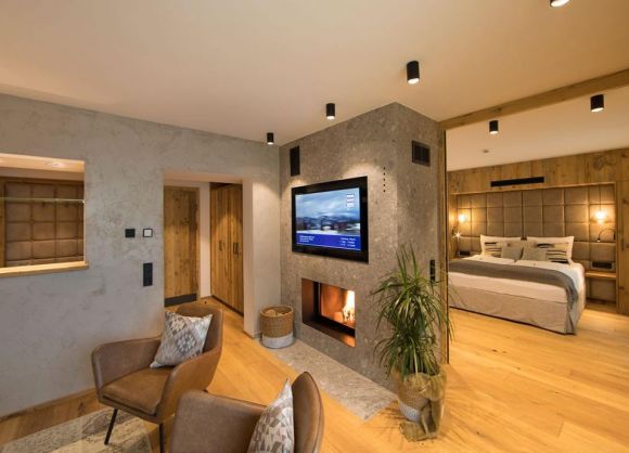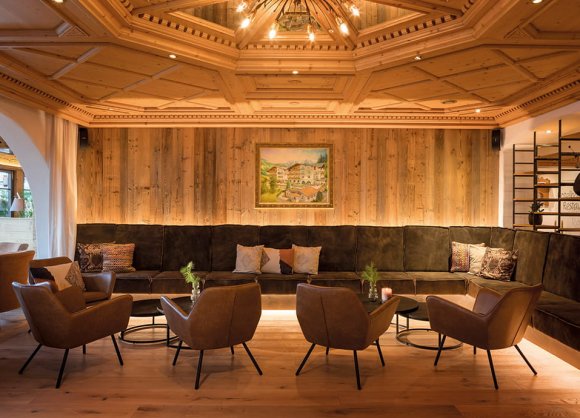 - Stimmungsvolle Hotelbar mit Bergblick und offenem Kamin